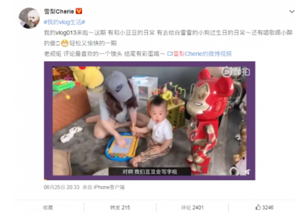 近日,网红雪梨在网上发布了一条VLOG,视频记录了她和孩子愉快的快乐时光,粉丝和她就像形成了某种默契,微博一经发出就立刻获得超过六千的点赞、评论。粉丝在评论里大呼对雪梨和她孩子的喜爱。在粉丝心目中,一方面雪梨是身边亲近、长不大的小女孩,同时也是再忙也要抽空陪伴小孩子的妈妈。