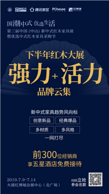 作为“新中式红木全国第一展”,新中式红木展日益成为国内家具和设计界认识新中式品牌与产品的窗口。本届新中式红木展由全联艺术红木家具专业委员会主办,将于7月9-14日在中国(大涌)红木文化博览城会展中心隆重启幕。