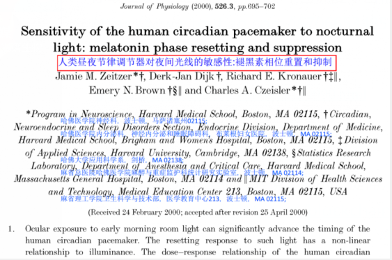 在2000年的时候,哈佛医学院、布莱根妇女医院等相关机构通过对23名志愿者进行了为期9天的实验,得出结论,光照对于人体内褪黑素的分泌有着明显的影响。