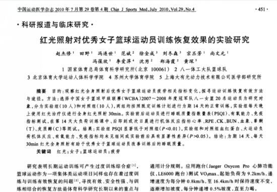 2010年7月,《中国运动医学杂志》的一篇研究报告表明,每天30分钟的红光照射有助于促进女子篮球运动员改善训练后的睡眠质量。