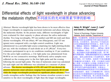 2004年,澳大利亚教授Helen和Leon的研究,更加精确的说明了,不同波长的光对于人体褪黑素分泌的影响有着明显的差异,470,495和525nm波长的蓝、绿光最能使夜间褪黑素的分泌提前。