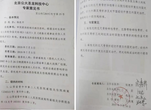据崔桂龙提供的一份时间为2019年7月10日《北京公大圣龙科技中心专家意见书》显示,崔桂龙的左尺骨粉碎性骨折、左腓骨粉碎性骨折、右内外踝双骨折三处,均到达当时四肢长骨骨折的轻伤鉴定标准。崔桂龙的左尺骨骨折经切开复位内固定治疗、右内外踝双骨折经切开复位内固定治疗,两处都构成当时的十级伤残。