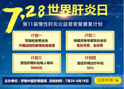 济南中医肝病医院长期坚持公益,为响应世界肝炎日“积极预防 主动检测 规范治疗 全面遏制肝炎危害”的主题,抗击肝炎,凝聚力量,提高人民健康福祉,解决患者看病贵的难题,举办第11届公益普查暨康复计划,时间7月28日-8月18日,常规检查费用全免,赠送陪同家属肝脏检查套餐,特邀京鲁专家联合会诊,免挂号费、会诊费,并提供药物补助和治疗补贴。