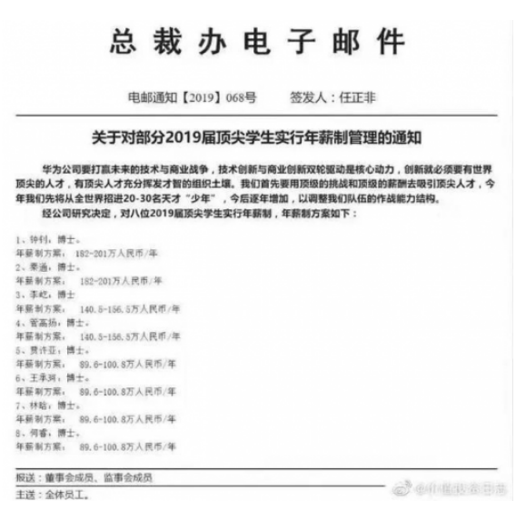 近日,华为的一则年薪制管理通知火了。据华为总裁办发布的邮件显示,华为对8位博士给予89.6万至201万的年薪。邮件还提到,华为要用顶级的挑战和顶级的薪酬去吸引顶尖人才,今年还将从全世界招进20-30名“天才少年”,今后逐年增加以调整队伍的作战能力结构。据悉,被给予百万年薪的这8位应届博士生分别来自清华、北大、中科院等名校,学习人工智能、计算机、机器人等专业。