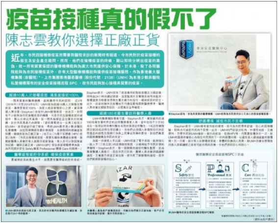 一间具质素的医疗机构,能够获得市民的认同, 近3年 (2016年7月至2019年6月),UMH曾为超过10万人次接种各类疫苗,满意度接近100%,为客人疫苗接种安心之选。资深传媒人陈志云(Stephen)亦曾于UMH接种疫苗,他表示,坊间有不少能够为市民接种疫苗的机构,可是市民在接种疫苗的过程中,难以分辨出其真伪,故一间具规模并且信誉良好的机构,对于市民是最大的保障。「最初是电视台一位员工给我介绍UMH,后来经过仔细了解后,得悉UMH是本港少数非医院私营机构由注册药剂师负责针药规管,由药剂师向药厂直接采购,确保疫苗为正厂正货。」他又以「九价子宫颈癌(HPV)疫苗」为例,「市民在接种疫苗前,需要先确保身体适合接种,接种前医疗人员会于客人前展示疫苗货盒,客人亦可以取回货盒作纪录,确保正厂正货,UMH以SPC 安全疫苗接种标准为首,为市民提供安全 Safety专业 Professional 关怀 Care 的服务。 」