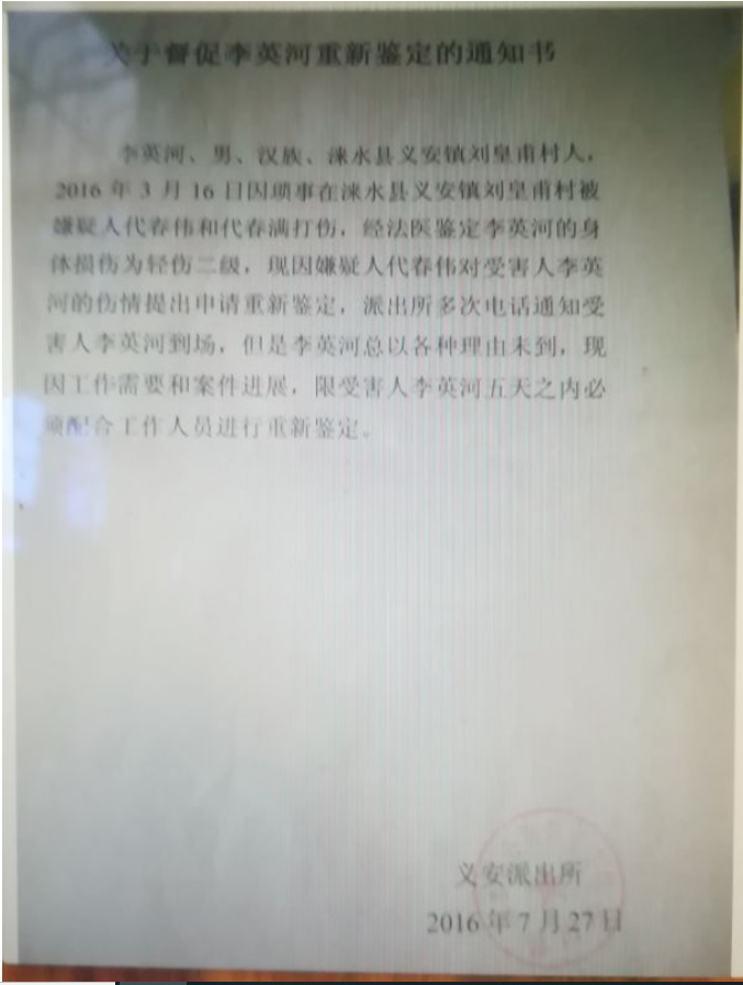 李英河说,由于不信任派出所,他不肯重新做伤残鉴定。但是,派出所和民警委托的村委会一再催促。最后,派出所还给他送了一个最后通牒式的通知,限令他“五天之内必须配合我们重新去做伤残鉴定”,他生怕派出所以他不肯重新做伤残鉴定为由不立案,才依了派出所。