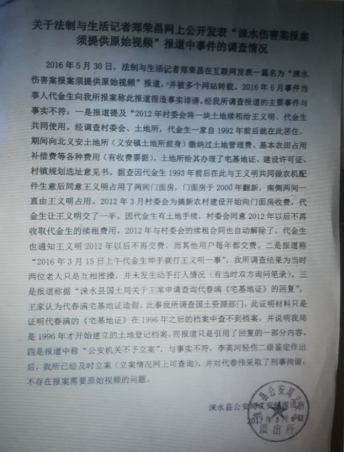 派出所指责《涞水伤害案,报案需提供原始视频?》一文“失实”,并称,民警没有说过“不提供原始视频不能立案”,派出所早就立案了,且对代春满、代春伟采取了拘留和取保候审措施,最后撤案是因为李英河的伤情确定为轻微伤,依法可以不立案。