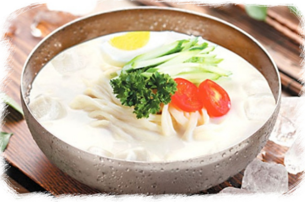 许多人在三伏天没有胃口,而一碗豆浆面则能给炎热疲惫的身心带来活力补养。黄豆素有“植物之肉”的美称,是摄取蛋白质的主要食物,韩国人认为,为了保证身体健康,必须每天都吃豆类食品。豆浆面做法简单,煮好的面条捞出后迅速放进冰水里过凉,洗去表面粘稠,再放入冰镇好的豆浆,加少量盐、鸡粉、芝麻碎等,最后摆上鸡蛋、蔬菜丝即可,吃的时候可以就泡菜,非常爽口。