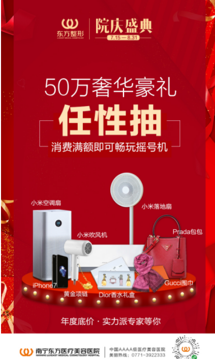 东方整形庆盛典火热进行中!倾情巨献,震撼全城,只为你一生一世的美丽。感恩回馈,底价抢购,50万奢华豪礼任性抽。Prada包包、Gucici围巾、iPhone,品牌香水口红、小米空调扇、小米落地扇等一线奢侈品牌任性送,消费满额即可参与摇号,100%中奖!还有上门礼、见面礼、充值礼,消费礼、抽奖礼、VIP超值套餐低至198元。福利多多,好礼多多,活动时间持续到8月31日,爱美的你,可千万不要错过啦!