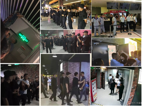然而,事态发展并非如此,8月3日15时左右,以F管理公司王某某带头的数十名身穿黑色衣服的人员进入富田影城,与此间隔不久,F管理公司高某、胡某、汪某某、刘某某、孙某某、白某等人随着身穿蓝色、白色、迷彩等衣服的人员从不同渠道涌入富田影城,其中有人手持录像设备,及类似铁棍的工具。监控录像显示,他们似乎分工明确,一部分人控制售票处,一部分人清理影城工作人员和约一千观影人员,一部分人断电、拆店牌,还有人手拿胶水填充影城内各个门的锁眼。