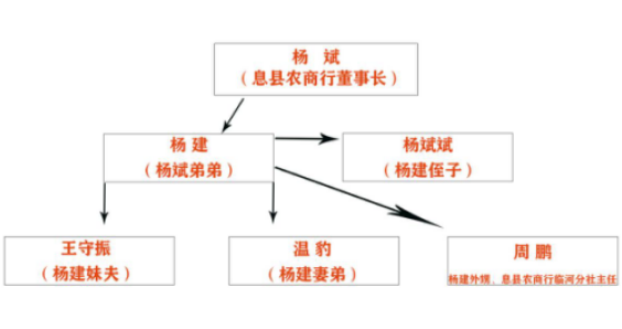 让我们来梳理一下参与整个贷款流程的人都和息县农商行董事长杨斌是什么关系。卷走2500万的杨建是息县农商行董事长杨斌本家弟弟,找的贷款人杨斌斌是杨建的侄子,瓜分150万的王守振是杨建的妹夫,瓜分450万的温豹是杨建的妻弟,临河分社主任周鹏是杨建的外甥为整个骗贷过程提供职务上的便利。