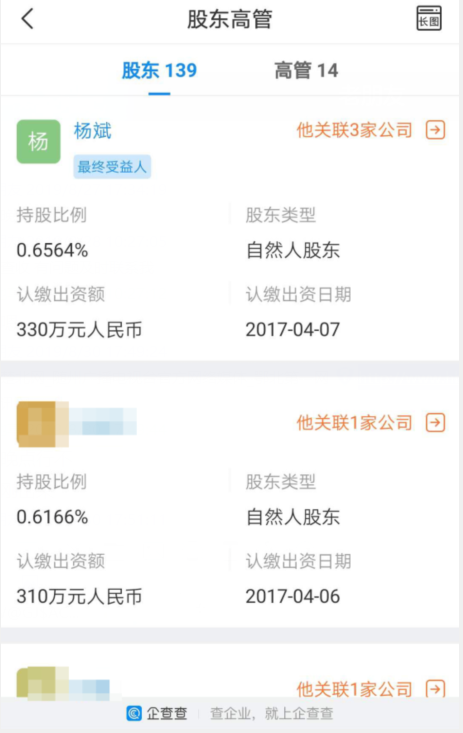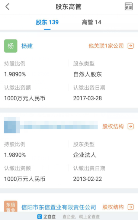 通过网上工商注册登记查询得知,杨氏家族几乎都在息县农商行占有不同比例的股份。其中杨斌持股0.6564%,出资额330万,杨建持股1.989%,出资额10000万,王守振持股1.6310%,出资额820万,周鹏持股0.3898%,出资额196万。