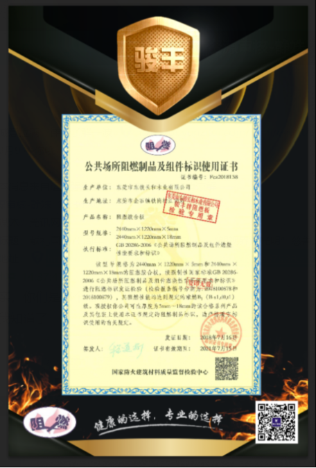 骏丰阻燃板顺利通过国家防火建筑材料质量监督检验中心检验,获得《公共场所阻燃制品及组件标识使用证书》。