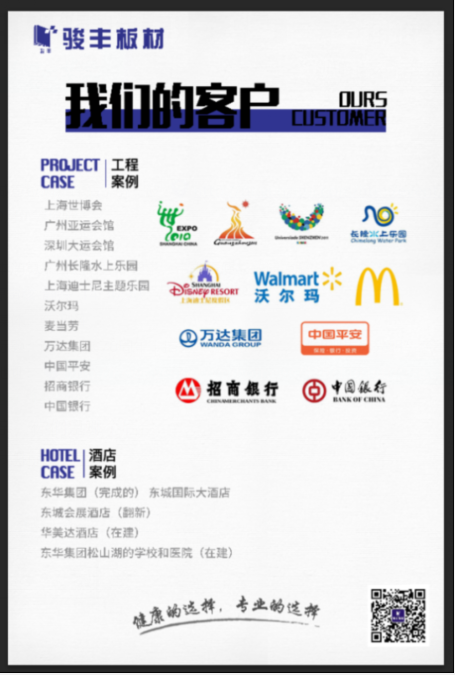 自上世纪80年代开始,骏丰板材就已经开启优质环保阻燃板的生产和不断探索实践,骏丰阻燃板已畅销国内外,不仅为广大中小学如东莞东华小学(生态园区)、惠州市外语幼儿园等提供优质板材,还承接多个大型场馆项目的阻燃板供应。