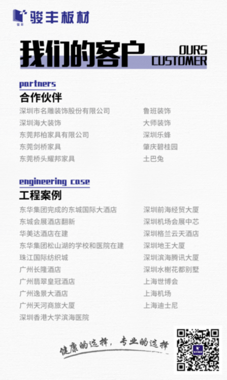 不止这些,骏丰板材现在合作的客户和服务的项目还有更多,还将持续发挥自身的优势,为更多高端优质项目服务。