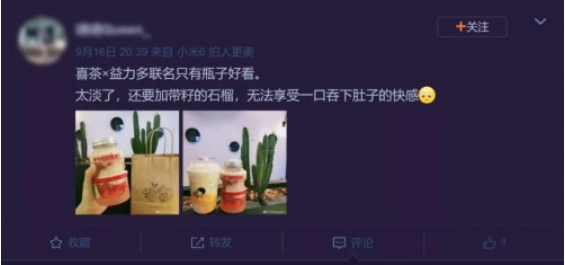 喜茶这次出的石榴养乐多波波冰,在产品包装上的确赚足了消费者的注意力,然而此次喜茶的联名新品似乎过于依赖合作方,除了“大”包装以外,似乎没有打造产品记忆点,而少了巨型养乐多包装的石榴养乐多波波冰,消费者并不买单。喜茶的那份致歉声明也就显得有些苍白了。