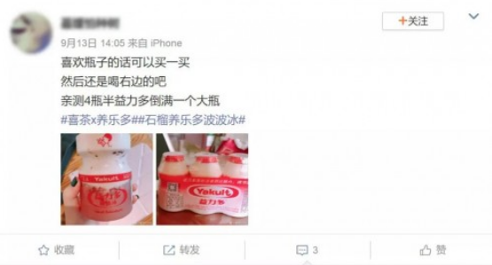 不过,这次与养乐多的联名,喜茶就显得有些“偷懒”了。石榴养乐多波波冰,除了产品的包装是一支身型变大5倍的养乐多外,似乎就没有其他的动作了。喜茶素有“站在营销上的网红奶茶”之称,营销技能之高甚至一度远超产品本身的名气,这么看来,这次跨界未免过于简单粗暴,粉丝们还等着喜茶接下来会有惊喜,不免有些让人失望。