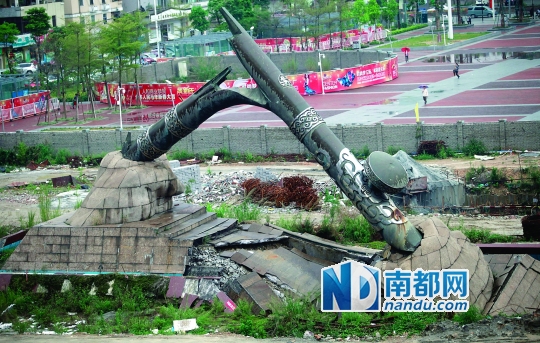 东莞虎门广场烟枪雕塑受暴风雨影响发生坍塌