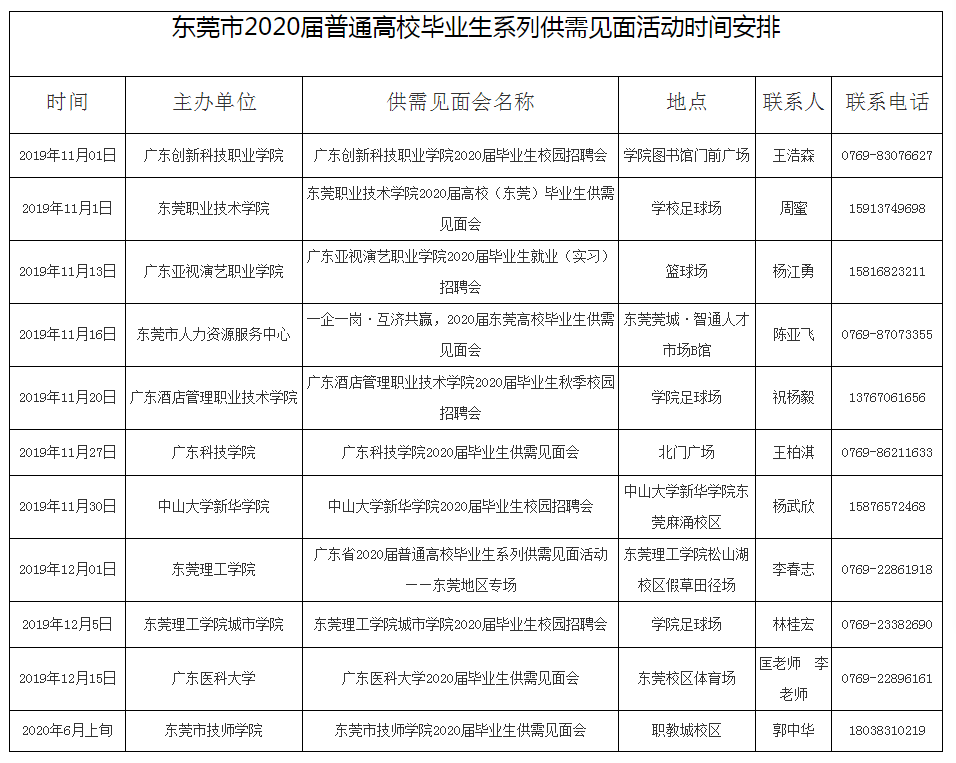 2020届高校应届毕业生招聘会来了!记者今日(31日)从市人力资源局了解到,为更好地为用人单位和普通高校毕业生双向选择创造条件,搭建促进就业的平台,在莞高校、智通人才和东莞市人力资源服务中心将共同主办11场2020届普通高校毕业生系列供需见面活动,于11月1日拉开帷幕。