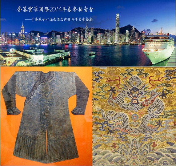 龙山八宝纹朝服: 圆领,右大襟,马蹄袖,有扣绊。蓝色缂丝面,石青素缎接袖,石青色缂五彩云蝠金龙纹领袖边,饰石青片边缘。袍身缂丝五爪金龙九条,正龙正襟危坐,一团威严,行龙极富活力,似动而非动。间饰云蝠、杂宝、海水江崖等图纹。蓝色地子,以捻金线、金丝线绣龙纹,龙纹间饰五彩流云纹,海水江崖纹,寓意“一统江山”、“万世升平”!