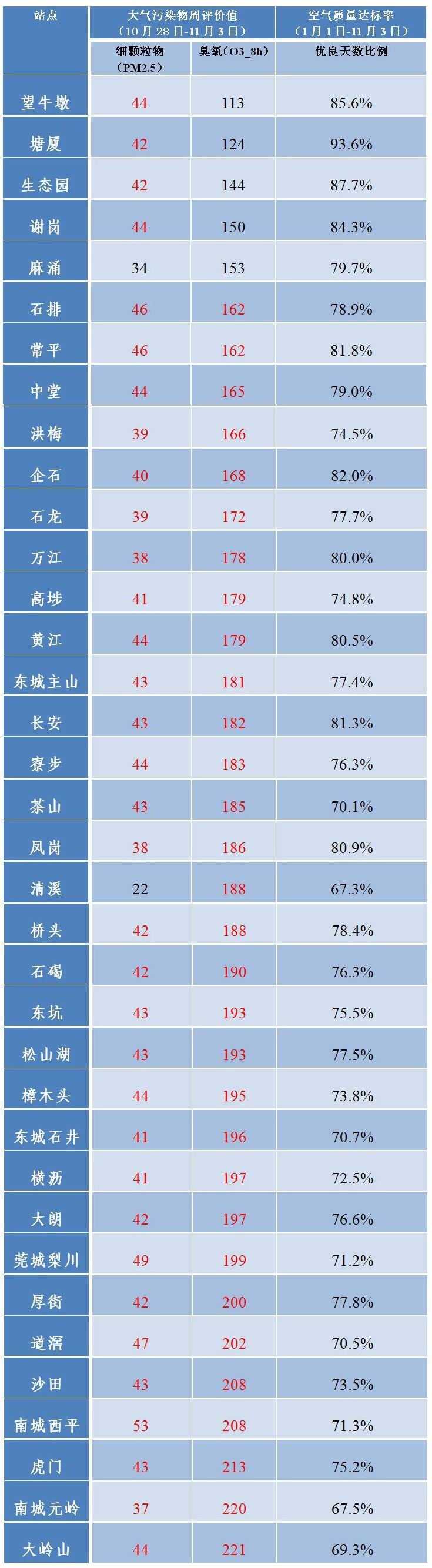 好转。今日(5日),市大气办通报全市各镇街(园区)上周(10月28日至11月3日)空气质量状况,全市空气质量状态没有重度污染。其中,良4天、轻度污染3天。臭氧仍然是影响空气质量的主要污染物。