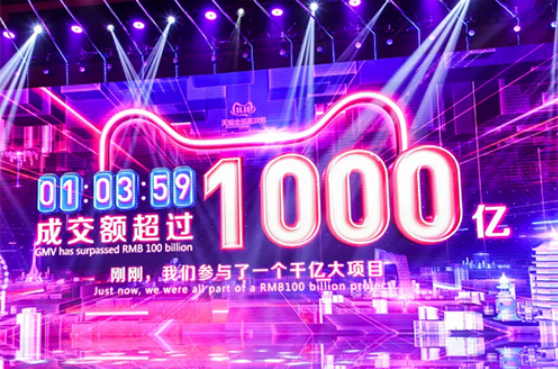 天猫双11开场仅1小时3分59秒,销售额破1000亿元。