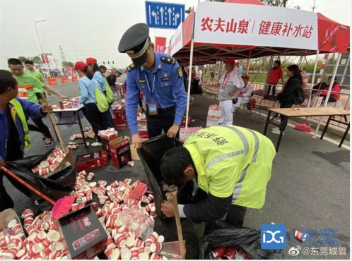天色渐亮时,跑手们已经在中心广场一带集结,为半小时后的开赛做准备。此时,东莞城管和环卫工人、园林绿化工人们已经在赛道沿线待命,为广大跑手们安心跑全力护航。记者看到,赛道沿线的补给点,除了志愿者,还有环卫工人忙碌的身影,全力做好补给点垃圾清运、现场保洁等工作。赛道外,东莞城管持续对各种城市“六乱”行为及时进行处置和疏导。