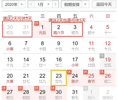 元旦节放假虽然只有1月1日这一天,但巧妙采用“拼假”——在2019年12月30日、31日请假2天,或者在2020年1月2日、3日请假两天,便可获得五天“小长假”。