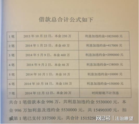 460万元借款7个月成了759万,就是这样,许淦铭7笔总计996万元贷款,在归还了300多万之后,加上利息、罚息、违约金总欠款达到了1515.25万元人民币。