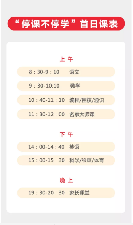 每天的直播都是按照课程表定点开始,和孩子在学校的学习体验一致。错过的课程,在本次直播课活动结束之前,都可以看回放。