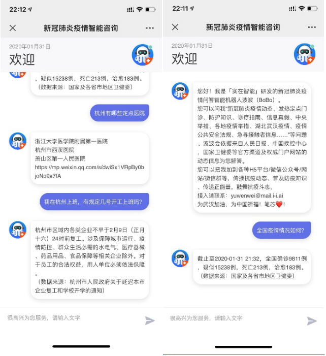 面对大众日益井喷的焦虑和困惑,以及公众渠道承接能力严重不足的瓶颈,「实在智能」(杭州实在智能科技有限公司)于正月初一通过电话会启动“实在公益“项目,决定为奋斗在抗击疫情一线的政府部门、医疗机构、公益组织以及各类社会团体提供力所能及的免费技术支持。当日,公司火线启动“新冠肺炎疫情咨询智能问答机器人”紧急开发,初五即上线内测。现已在多个微信公众号、APP、微信群及相关渠道加载,缓解了人工坐席资源紧张情况,同时传播抗疫动态、普及防疫知识、传递正能量,鼓舞抗疫斗志。