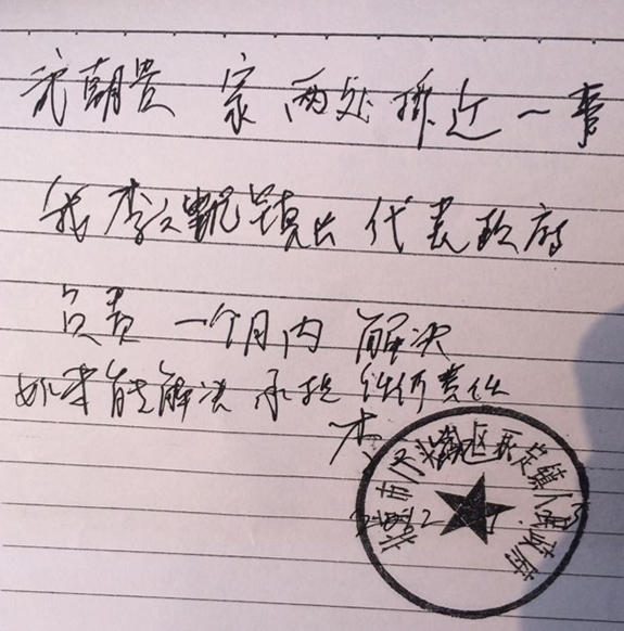 在记者采访结束后,武朝贵告诉记者,永定镇镇长李文凯答应他一个月之内解决他的拆迁问题,亲手写下了承诺书,并加盖了永定镇人民政府的公章。