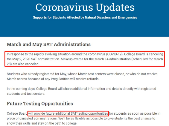 眼看着近期世界各地不明朗的疫情走势,作为14年深耕留学教育领域的和创留学,一直密切关注着留学相关的消息动态,对于SAT考试,和创留学咨询师预测5月份的SAT有可能会取消。果然,事实也正如和创留学咨询师所预测的一样,cb官网最新公告,取消掉了5月份的SAT考试,同时也包含3月份的补考安排。虽然6月份的SAT 2考试还没有取消的通知,其实大家都懂得SAT和SAT 2在申请中的分量有多么大的悬殊。cb在公告中表示会尽可能为广大考生额外提供加考机会,这个美好的愿景是否真的能够实现?其实很大程度上还要看接下来疫情在全球的走势如何,没有人能够说得准会不会有加考,即使加考,是要等到什么时候,也很难说。
