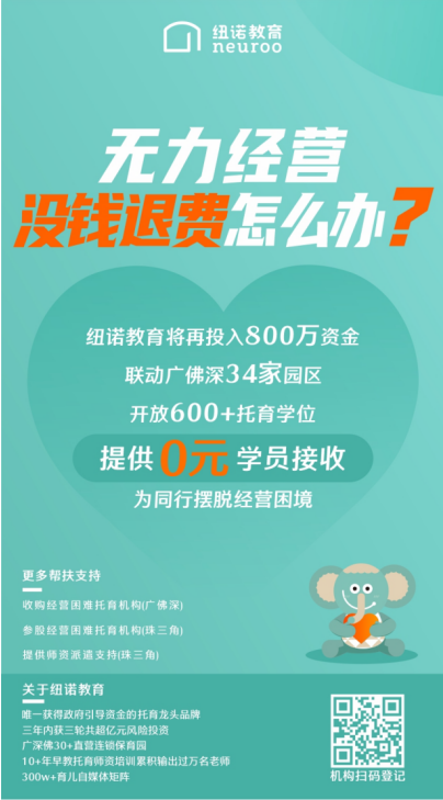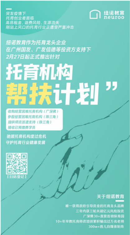 此前,2月27日纽诺教育已经联同广州国发、广发信德投入2000万-3000万启动“托育机构帮扶计划”,为在资金、招生、运营等方面遇到困难的同行机构,提供专业运营支持、师资派遣支持、接受收购或参股等资金支持。据了解该项目已收到70+家困难托育机构报名。