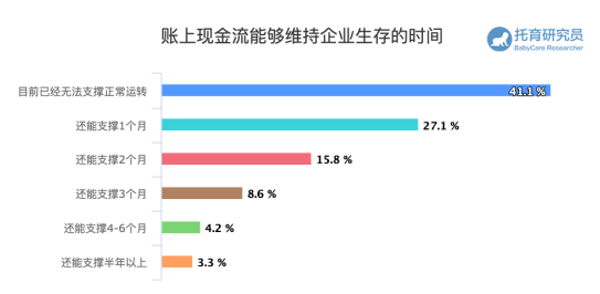 据托育研究员报道,目前托育行业绝大多数机构处在微小企业阶段,超过一半的机构经营时间不超3年,抗风险的能力还是相对较低的。疫情之下,托育机构被迫暂停线下服务,有9成以上的机构,现金流难以支撑超过3个月,40%的机构在2月份已无法正常运转。
