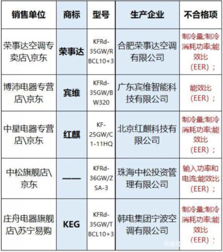 共检出不合格空调5批次,全部检自电商平台,涉及荣事达、宾维、红麒、KEG等品牌,具体名单如下。