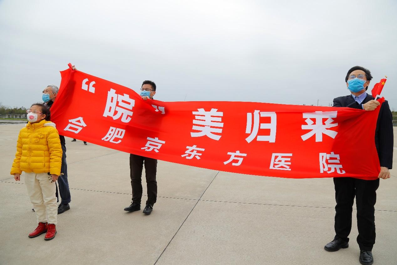 现场举行了简短而温馨的欢迎仪式,合肥京东方医院院长何仿、总经理章万纯、医疗院长陈炳官到机场迎接。欢迎仪式结束后,医疗队成员乘坐大巴前往指定隔离点,进行为期14天的休整和医学隔离观察。