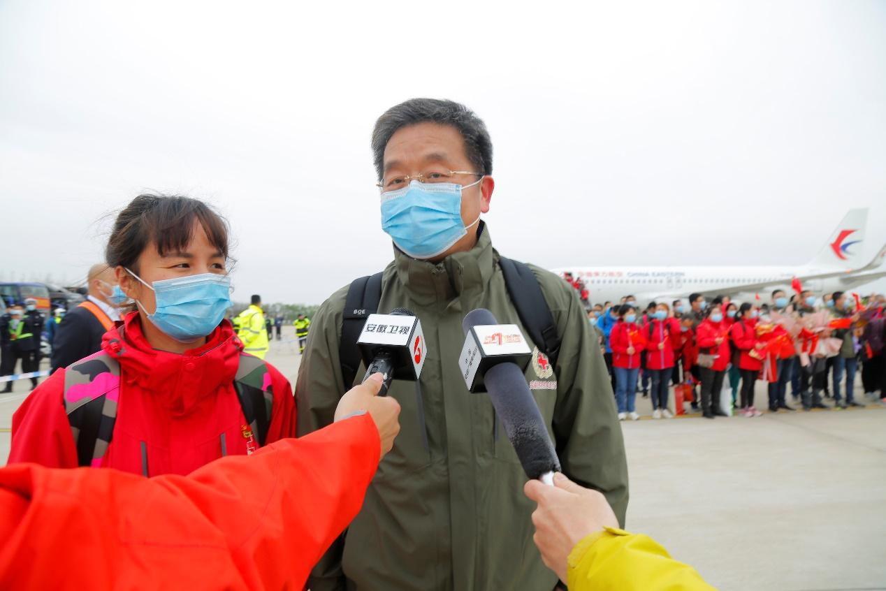 王建明主任代表全体队员介绍战“疫”情况。他说:“合肥京东方医院8名医疗队员在武汉连续奋战48天,与武汉这座城市同呼吸,与武汉人民共命运。刚到武汉时,我们看到曾经人头涌动的街头空空荡荡,曾经车水马龙的街道一眼就能望到头,新闻中是不断增加的新冠肺炎确诊数字。今天,方舱医院已休舱,新增确诊人数已归零多日,定点医院正有序撤点。樱花在绽放,武汉已重启,热干面已经醒来!我们实现了出发前的誓言,不辱使命,平安返回,加油武汉!——我们一起奋斗过的城市。”