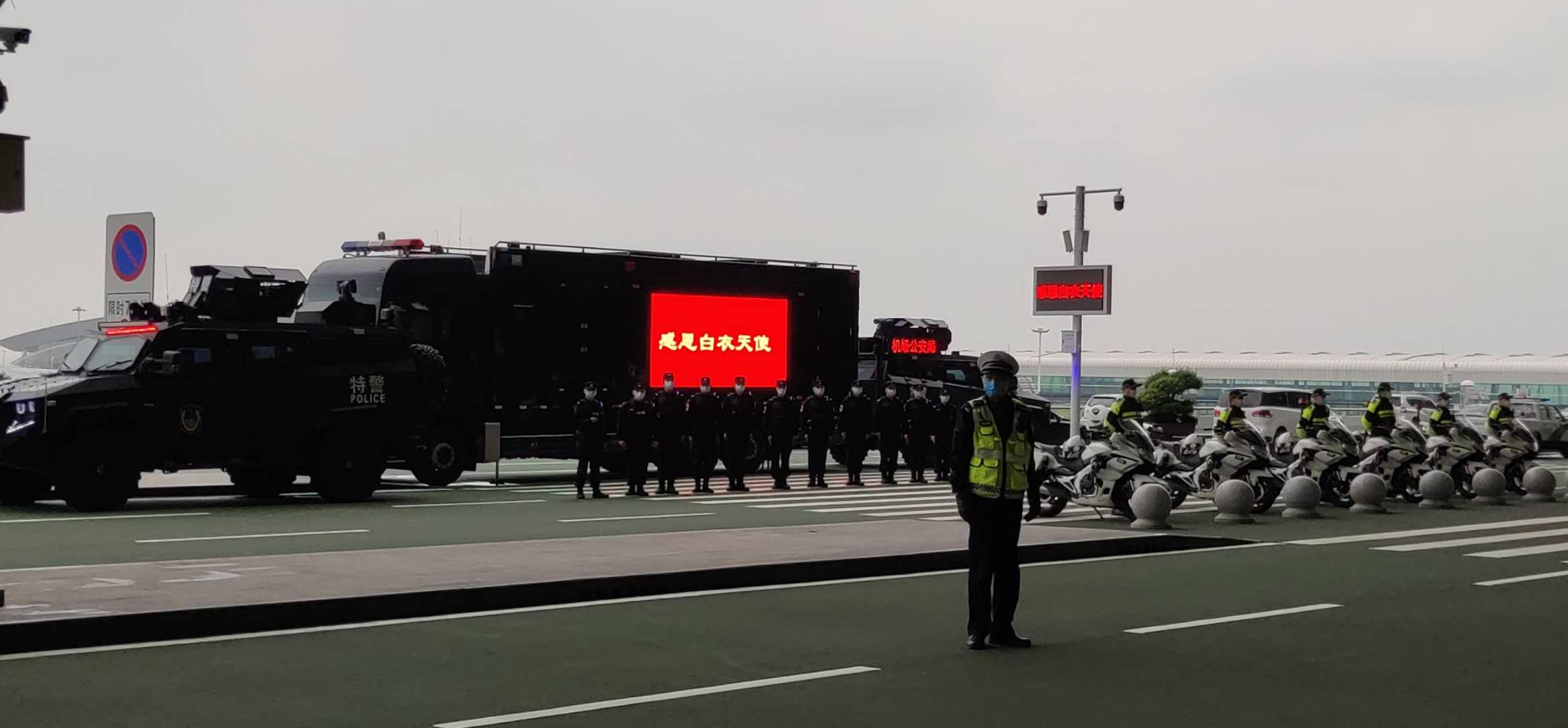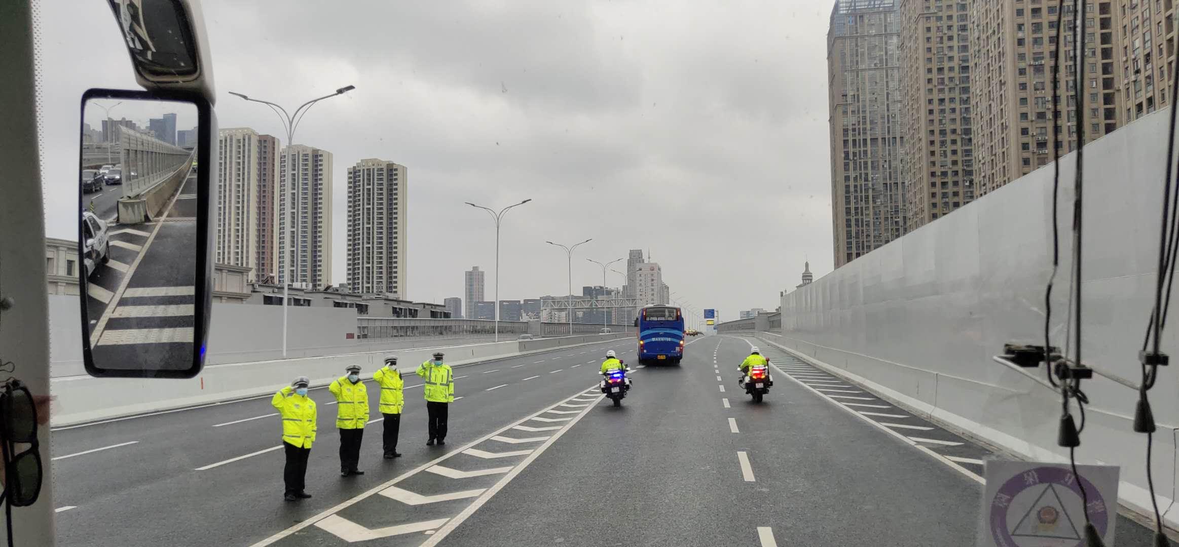 车队行经之处,武汉沿途市民夹道欢送,人民警察列队向车队敬礼致意。