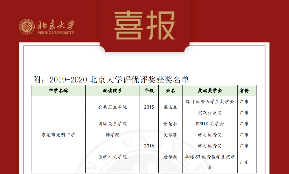 日前,光明中学收到北京大学发来的喜报。喜报通报了光明中学4名往届毕业生在2019-2020学年评优评奖获奖情况。