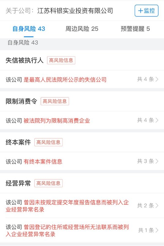 据工商信息查询,这家科银公司“劣迹斑斑”。该公司2014年成立,注册地址泰兴市济川路1号(原注册地址泰兴市河失镇刘关村)。2015年公司名称由江苏科银实业有限公司变更为江苏科银实业投资有限公司。目前该公司系最高人民法院所公示的失信公司、被法院列为限制高消费企业、被市场监督局列为经营异常名录。