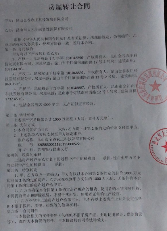 刘宝山及其所有的大元担保公司,要求必须先签房屋买卖合同,房产过户到刘宝山公司名下才能贷款。2017年底武洪平的昆山金谷农庄科技发展有限公司与刘宝山的昆山大元担保有限公司签订房屋转让合同,约定以1000万的价格转让金谷公司7000平的房产。