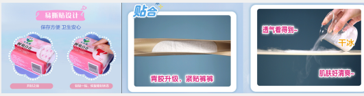 在产品性能方面,3款产品的背胶均有升级,紧贴内裤不易移位,即使大幅度活动也不易褶皱,贴合身体;巾身采用轻柔表层材料,温柔呵护私密肌;更新增精致印花,多方位防漏防扩散,可轻松吸收经期前后的少量经血。