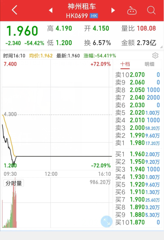 4月3日,陆正耀为瑞幸咖啡和神州优车的实际控股人、投资人,在港股上市的神州租车开盘后不久便暴跌70%,直接导致神州租车在上午10时许开始采取紧急停牌措施,同时,与神州租车有关的所有结构性产品也暂停交易。截至今日收盘,神州租车仍未开盘,停牌前股价定格在1.96港元,跌幅为54.42%,市值缩水近50亿港元(折合人民币超45亿元)。