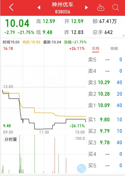 在新三板上市的神州优车也未能幸免。截至今日收盘,神州优车股价大跌21.75%至10.04元,市值缩水近75亿元。