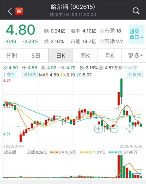 3月20日开始,哈尔斯开启暴涨暴跌行情。3月26日龙虎榜数据显示,超大单、大单和中单纷纷卖出,仅有小单资金买入较多。4月3日,截至中午收盘,哈尔斯跌3.23%,报4.8元。