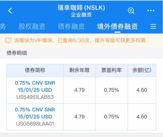 企业预警通显示,2020年1月14日瑞幸咖啡发行了两只美元债,发行规模共9亿美元,票面利率0.75%,余额合计9.2亿美元,均将于2025年1月15日到期,债券并无担保方。