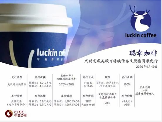 此外,2020年1月10日,瑞幸咖啡发行了1只美股可转债,发行规模为4亿美元(“绿鞋”后4.6亿美元,假设全额行使),票面利率0.75%,初始转股溢价率30%,期限为5年期附第3年末投资者回售权,发行价格100%。
