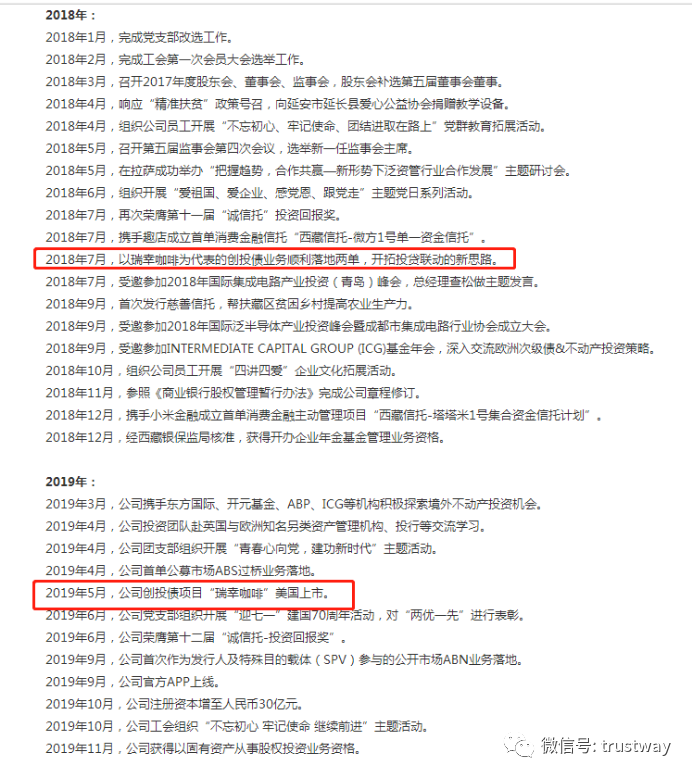 西藏信托官网的“公司大事记”一栏中关于瑞幸咖啡的往来有两部分:其一是“2018年7月,以瑞幸咖啡为代表的创投债业务顺利落地两单,开拓投贷联动的新思路”,其二是“2019年5月,公司创投债项目‘瑞幸咖啡’美国上市。”