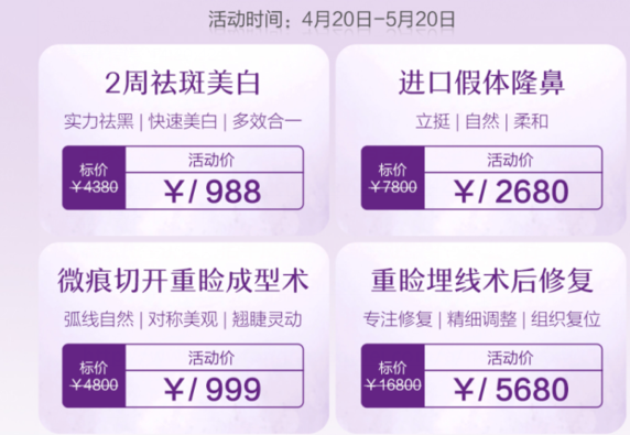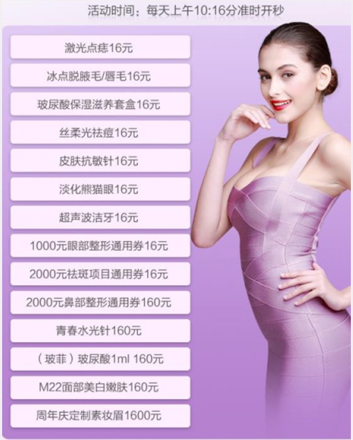 4月20日—5月20日,每天早上10点16分开启秒杀专场,点痣16元、脱腋毛/唇毛16元、玻尿酸保湿滋养套盒16元、皮肤抗敏针16元、1000元眼部整形通用券16元、2000元鼻部整形通用券160元、2000元祛斑项目通用券16元、周年庆定制素妆眉1600元等多款秒杀项目等你来抢!